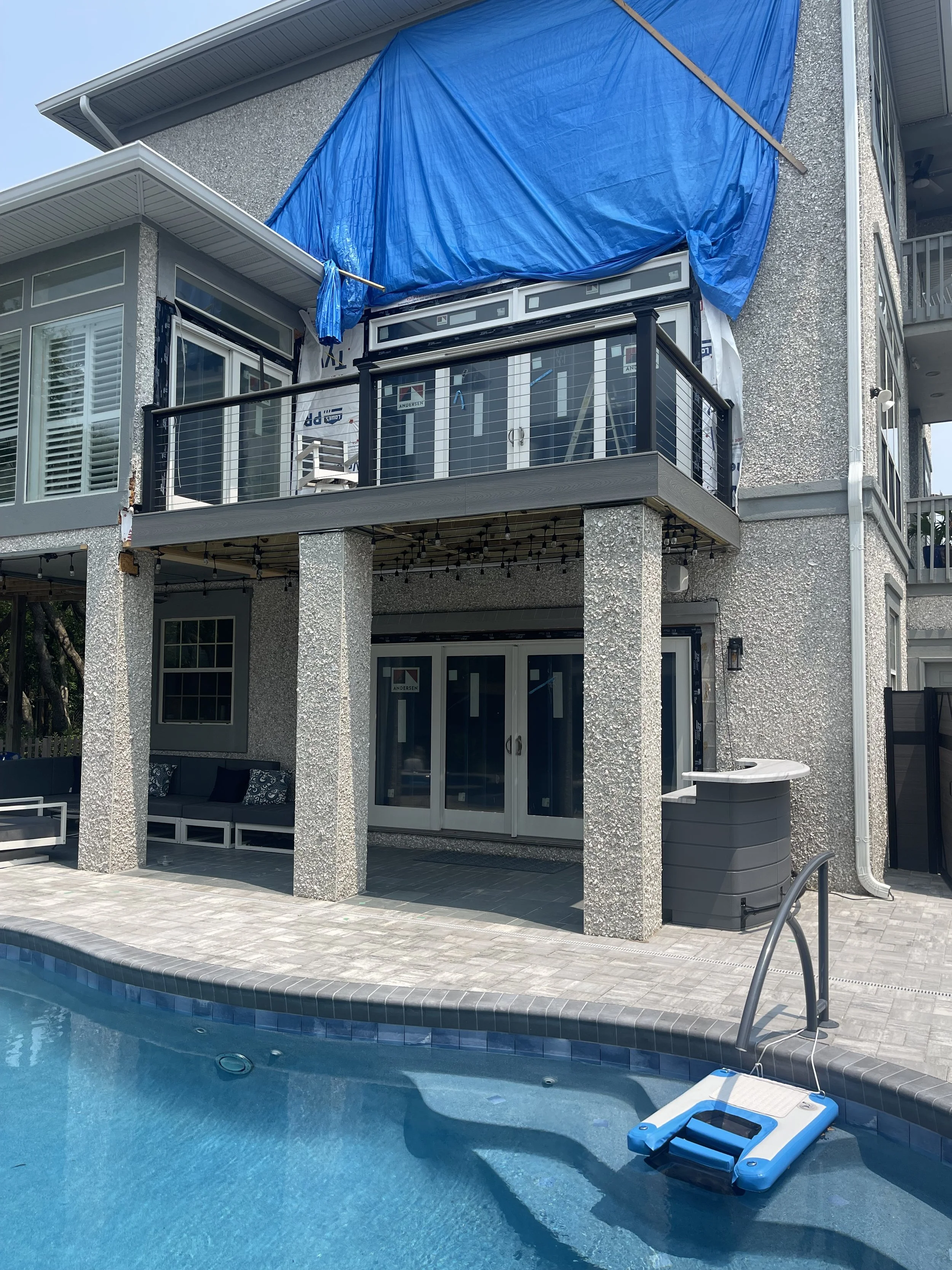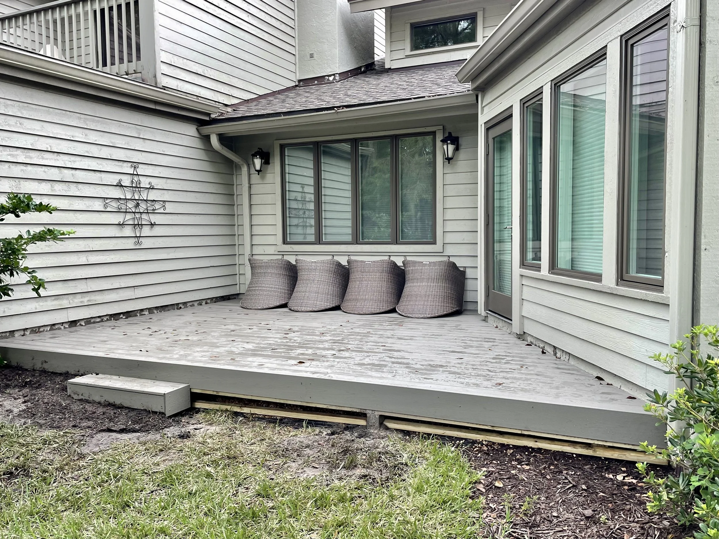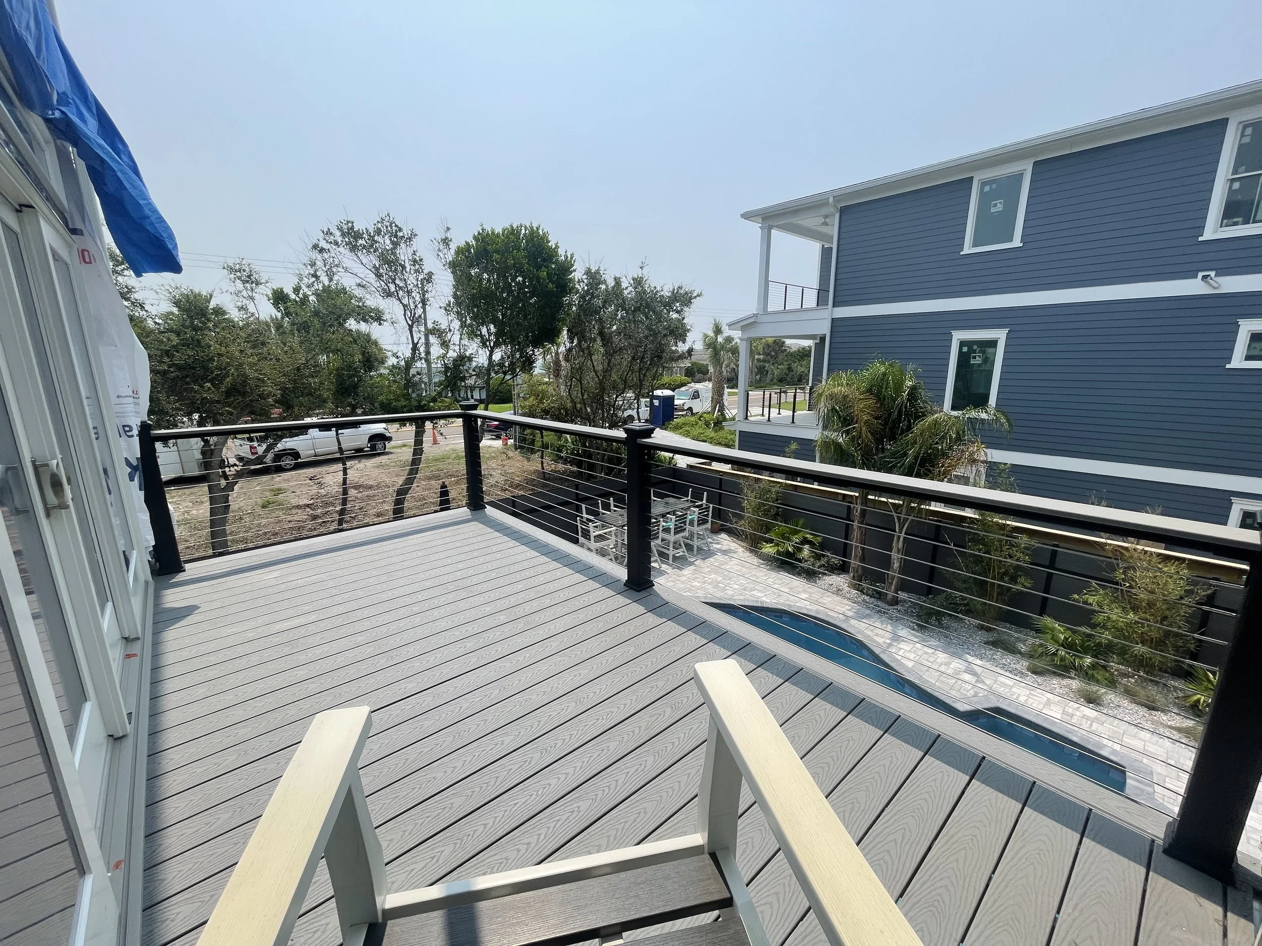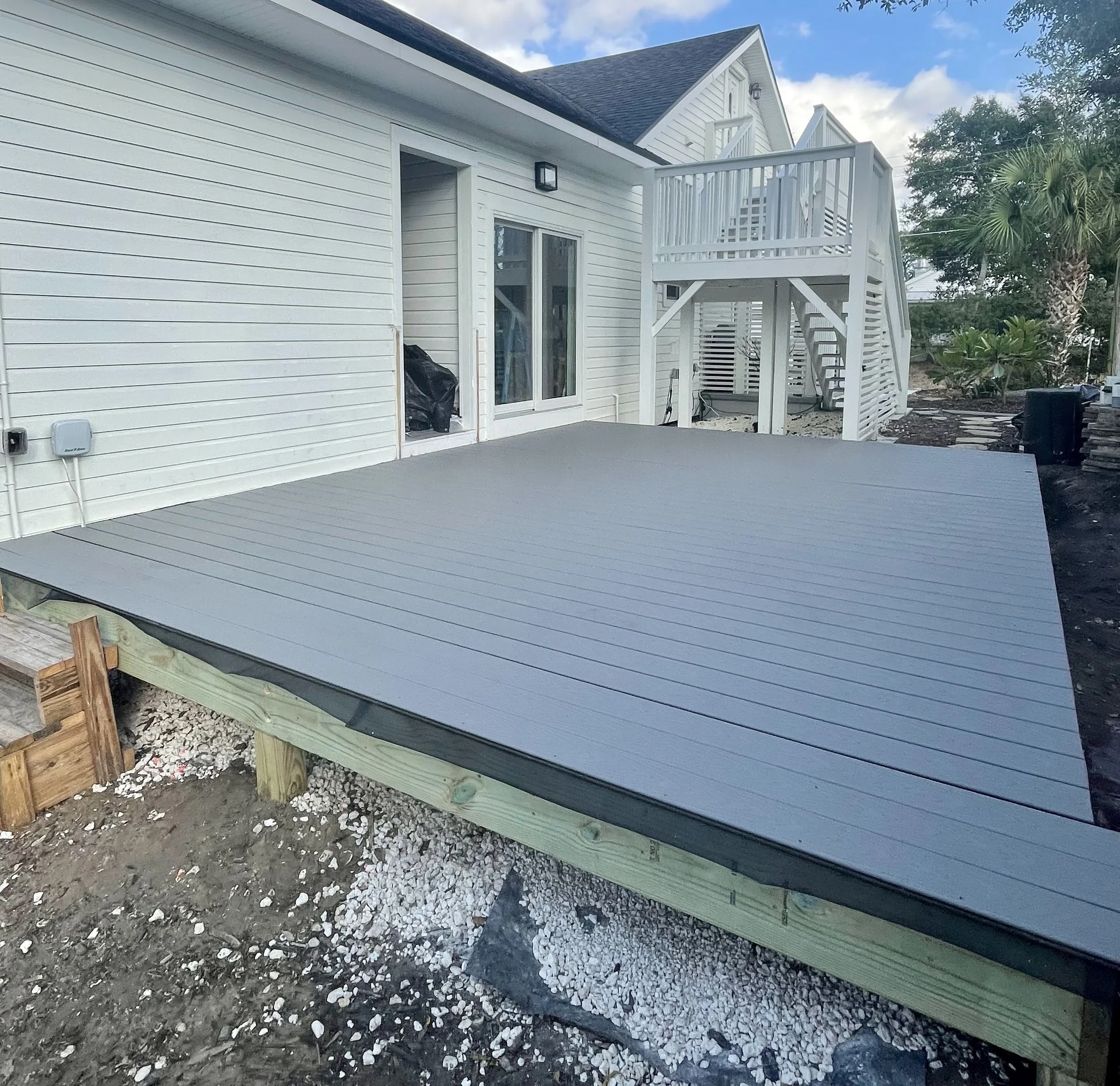 Custom 700 sq ft Timbertech Deck addition including an 18' arc (9' Radius). Including some custom box steps, dry bar, skirting, and planter