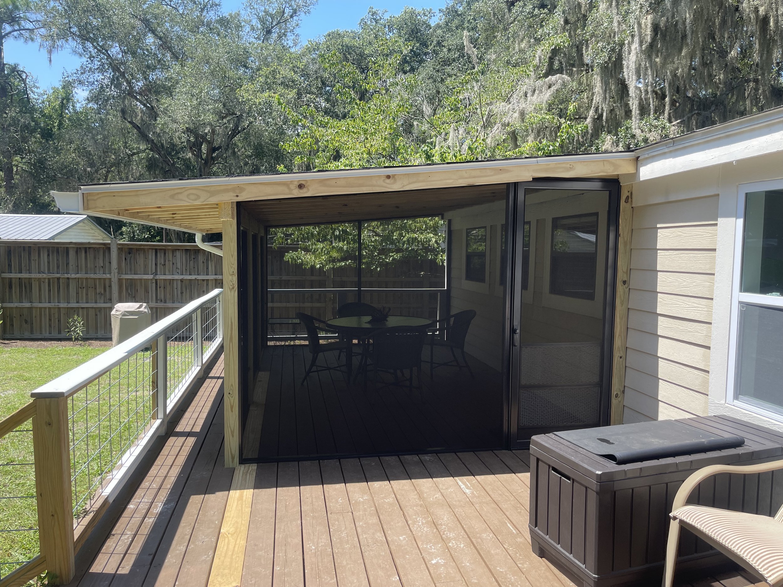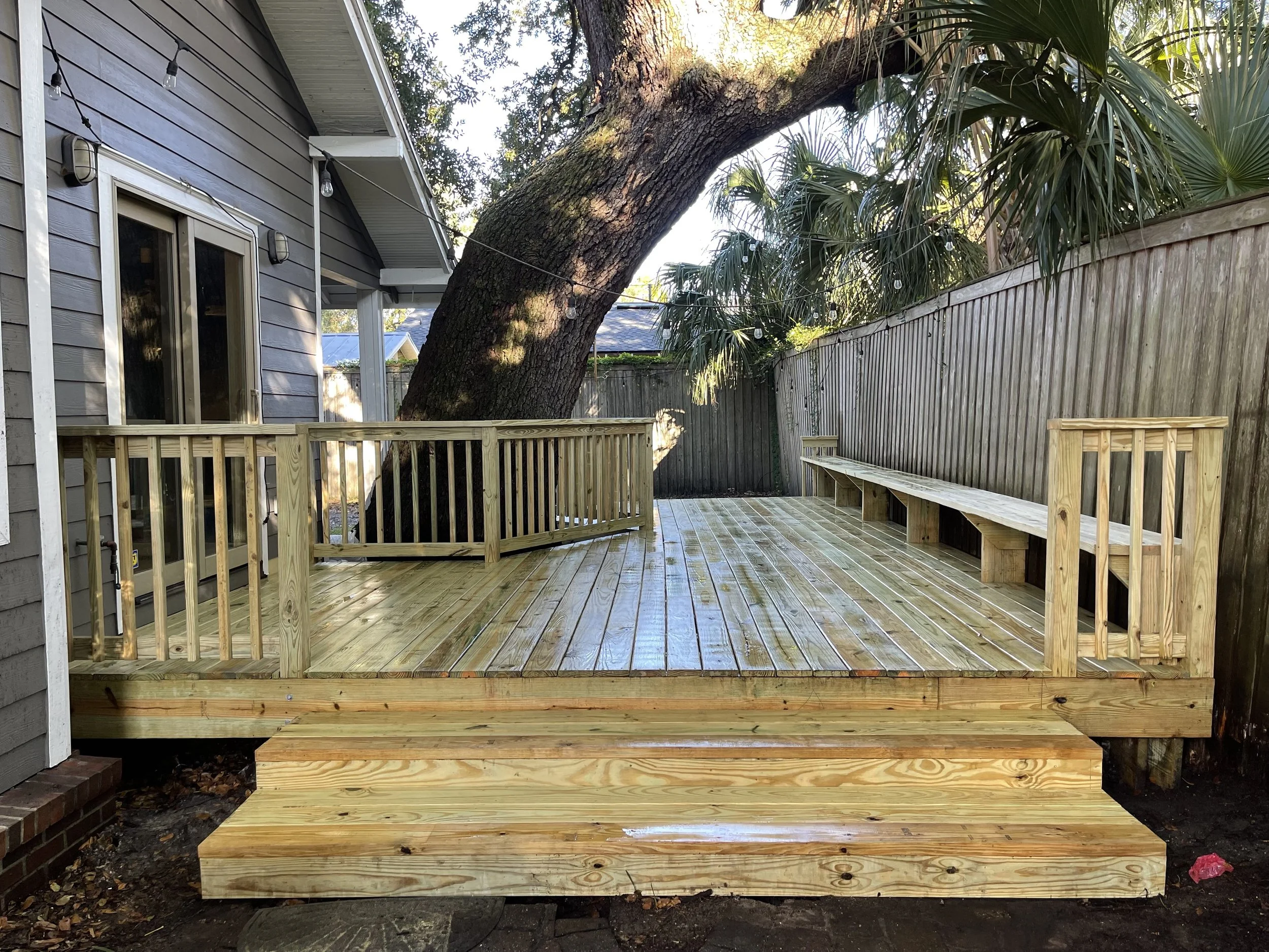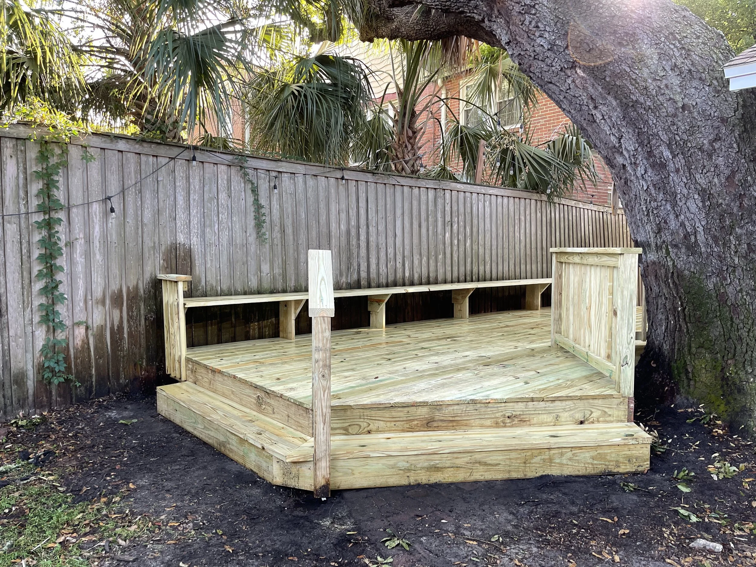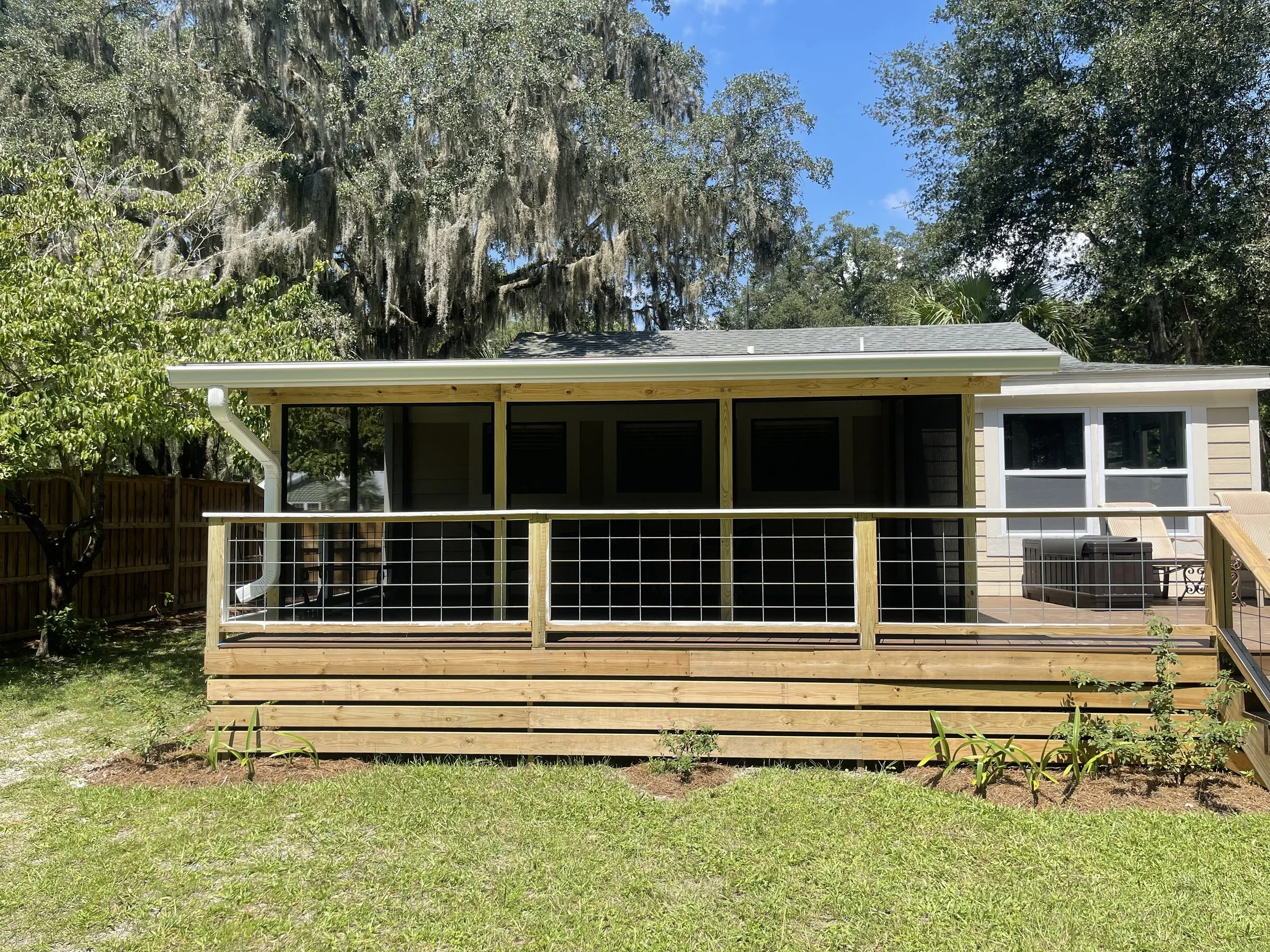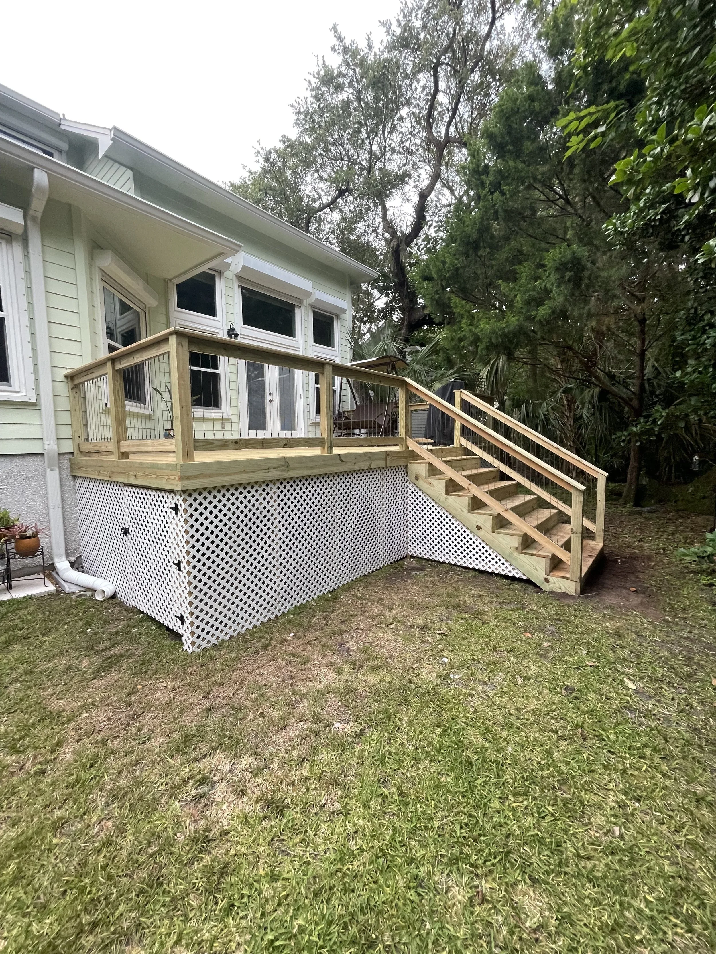 Custom 700 sq ft Timbertech Deck addition including an 18' arc (9' Radius). Including some custom box steps, dry bar, skirting, and planter