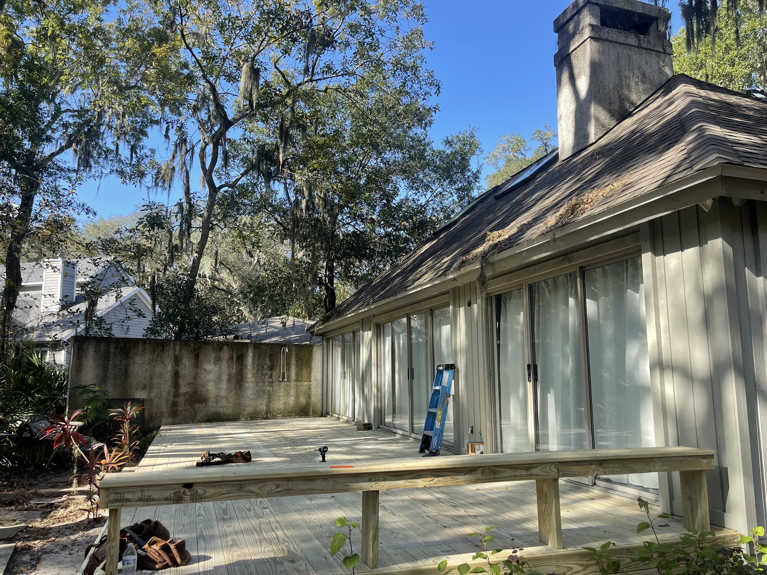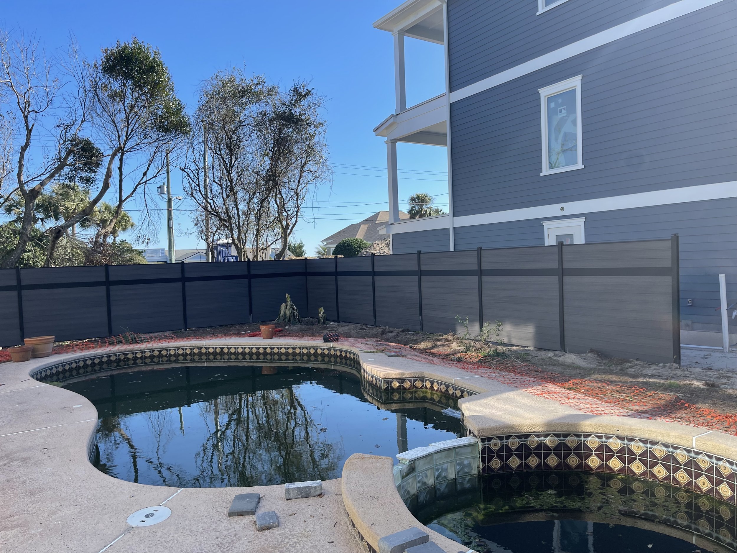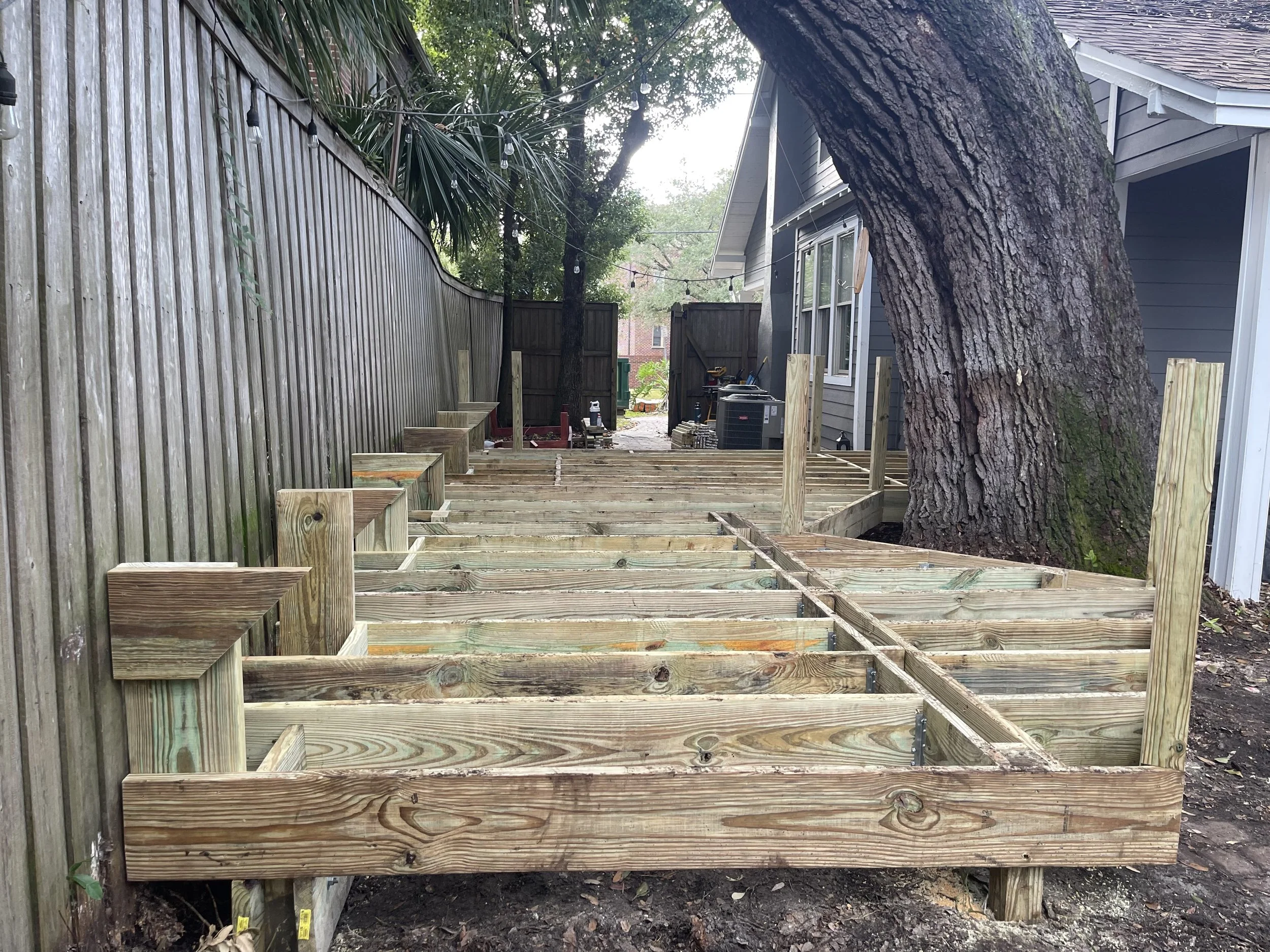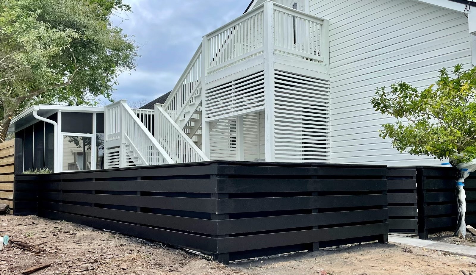 Custom 700 sq ft Timbertech Deck addition including an 18' arc (9' Radius). Including some custom box steps, dry bar, skirting, and planter